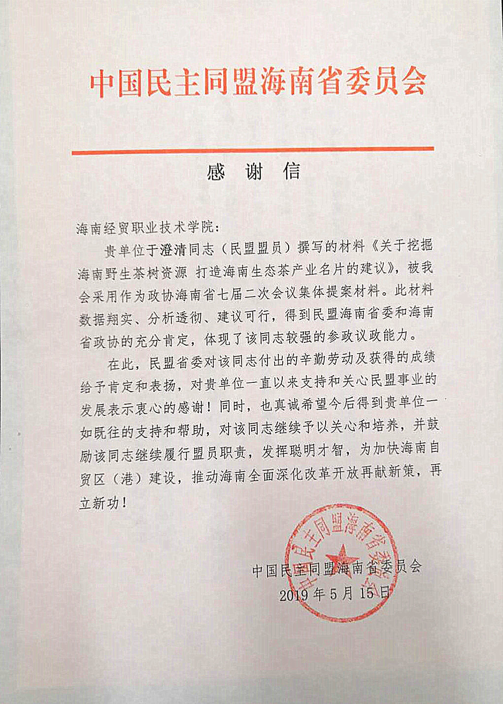 中国民主同盟海南省委致betway西汉姆联官网的感谢信