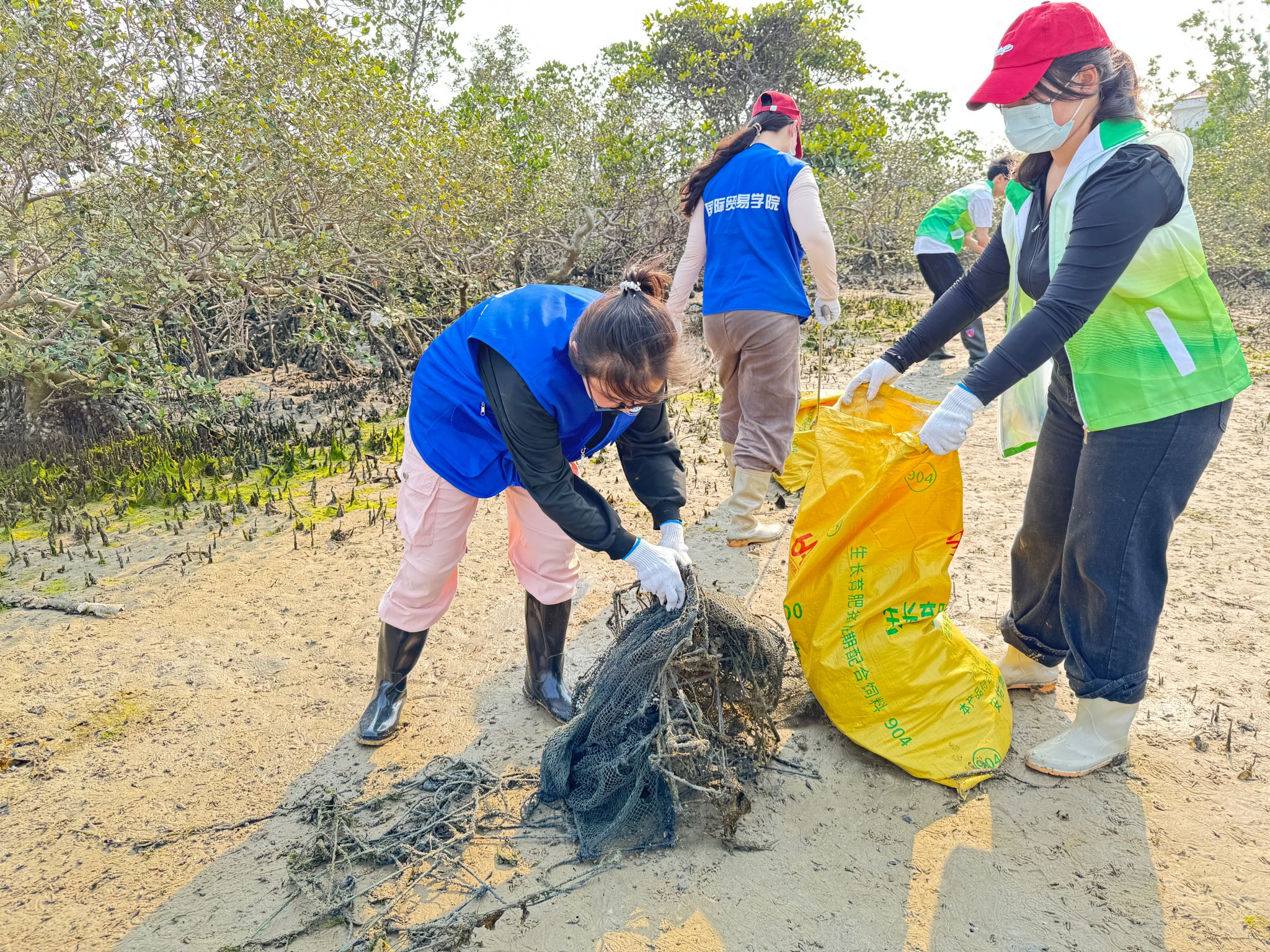 志愿者们以小组对抗比赛的形式进行净滩活动。他们不畏烈日,携带垃圾袋、钳子等工具,沿着退潮后的红树林滩涂,细致搜寻并清理各类垃圾,将塑料瓶、包装袋、泡沫箱、废弃渔网等垃圾一一拾起,以实际行动为滨海渔村增添生态魅力。