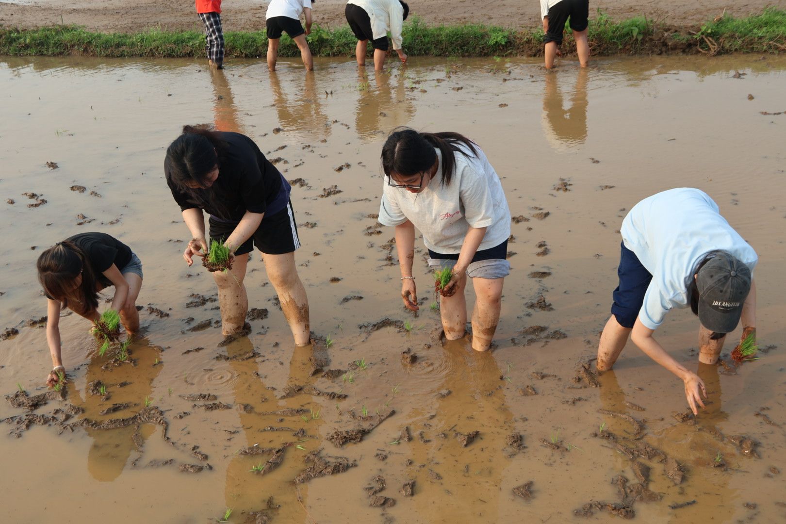 “深浅要适中,行距要均匀!”在村民的示范下,同学们撸起袖子、卷起裤腿,赤脚踩入泥泞的水田,一场别开生面的“稻田思政课”在田埂边开讲:“从‘看天吃饭’到‘南繁硅谷’,中国用不到9%的耕地养活世界近20%人口,这就是你们手中秧苗的分量!端牢中国饭碗需要代代接力。”大家左手握秧苗,右手分株插秧,起初生疏的动作逐渐熟练,绿油油的秧苗整齐扎根田间。