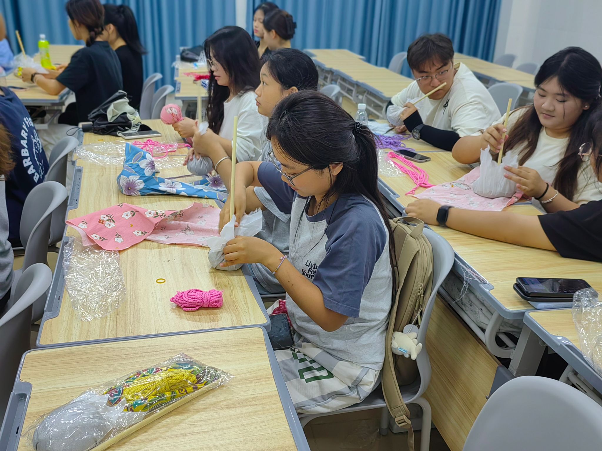 此次活动以中华优秀传统文化为纽带,结合手工制作艾草手工艺品形式展开。在辅导员的指导下,同学们通过揉捏、缠绕、捆扎等步骤,将艾草叶、棉布等材料转化为兼具实用与观赏性的艾草养生锤。现场氛围温馨愉快,同学们在艾香里建立情感联结,传递温暖关怀,缓解日常学业与生活中的不良情绪。