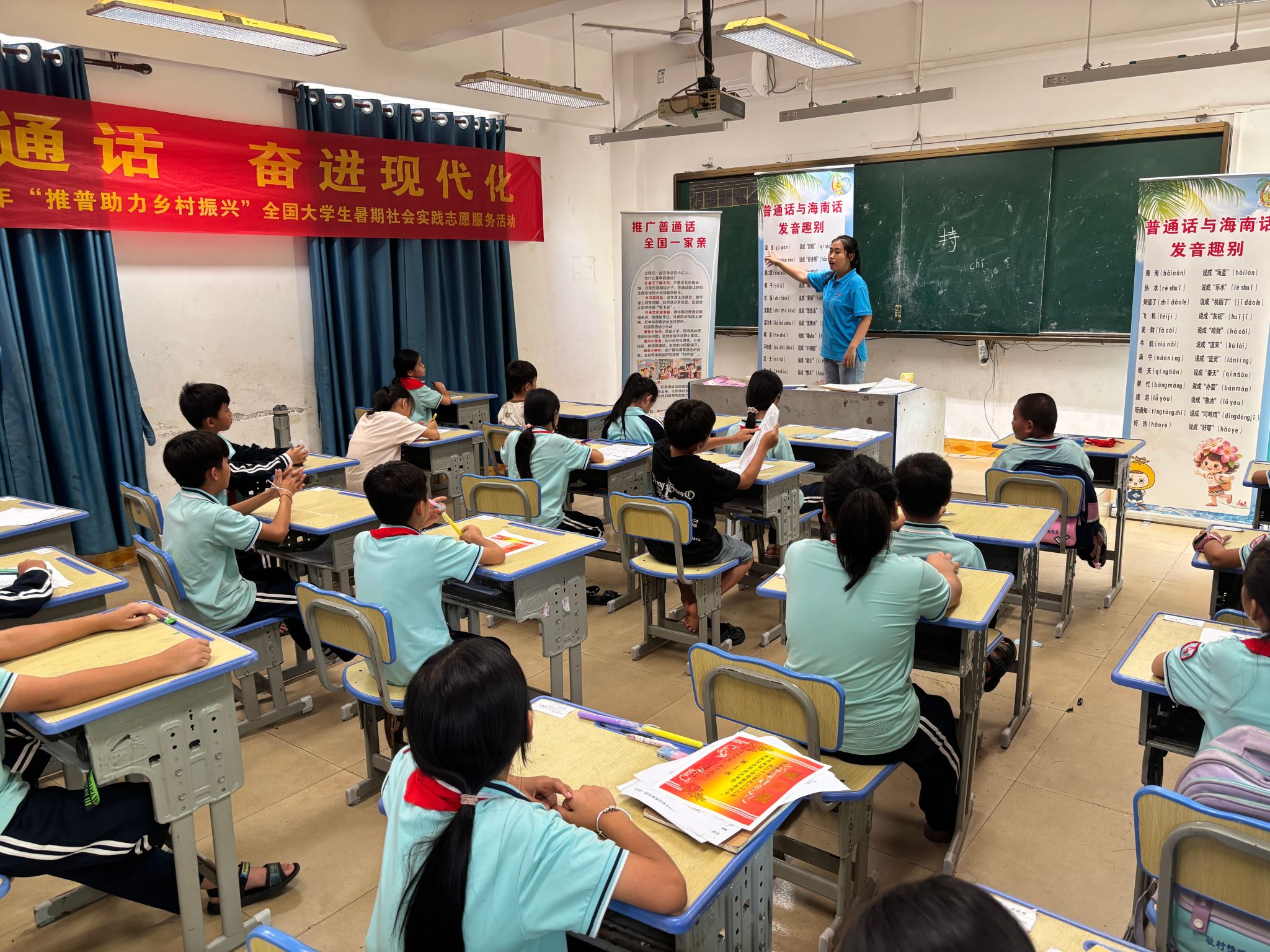 期间,队员与孩子们共同完成《少年中国说》集体朗诵、普通话绕口令挑战、古诗词规范书写,并通过“普通话与海南话发音对比”讲解、识字拼图、“你比划我来猜”等趣味游戏,打造“经典诵读+方言文化碰撞+趣味互动”的沉浸式推普体验,让普通话以鲜活方式融入乡村孩子日常,在潜移默化中厚植语言文化传承使命感,提升以语言反哺家乡的社会责任感。针对昌江黎族自治县学生常见的发音误区如平翘舌混淆等问题,实践队员结合实例耐心示范纠正、开展教学。