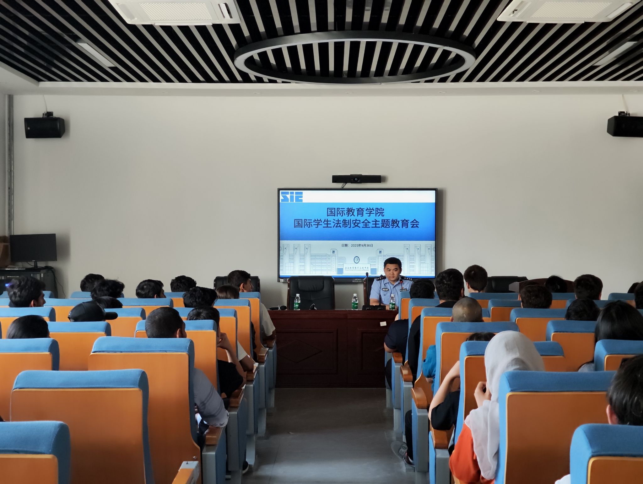2025年9月30日,在国际教育学院邀请下,海口市公安局出入境管理支队警官詹家仪、高嘉悦来校,为全体在校国际学生举办专题法制宣传讲座,并对签证办理事宜答疑,帮助国际学生系统掌握在华生活必备的法律知识与安全技能。