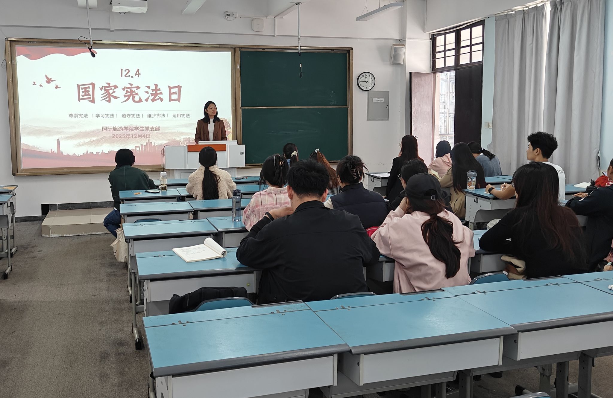 为深入开展宪法宣传教育,2025年12月4日,国际旅游学院学生党支部组织开展了“弘扬宪法精神,增强宪法意识”主题党日活动暨宪法知识竞赛。党支部全体党员及入党积极分子参加。