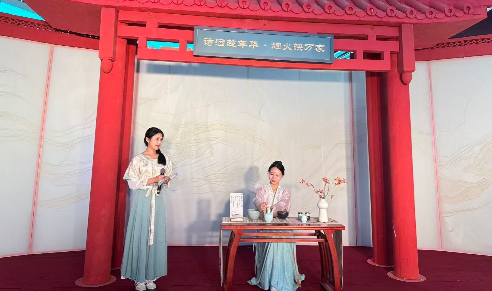 活动现场,身着宋代服饰的学生们神情专注、动作娴熟,完整演绎了宋代“七汤点茶法”。从注水击拂,到巧妙勾勒图案,每一个环节都有条不紊、精准到位。茶筅在茶盏中轻搅流转,乳白色的茶沫渐渐凝聚成型,点茶完毕于茶沫上作画,山水、花鸟等精致的图案便在茶盏中显现,完美还原了宋代点茶的雅致意境。不少观众驻足观赏、拍照留念,沉浸式体验宋韵文化的独特魅力。
