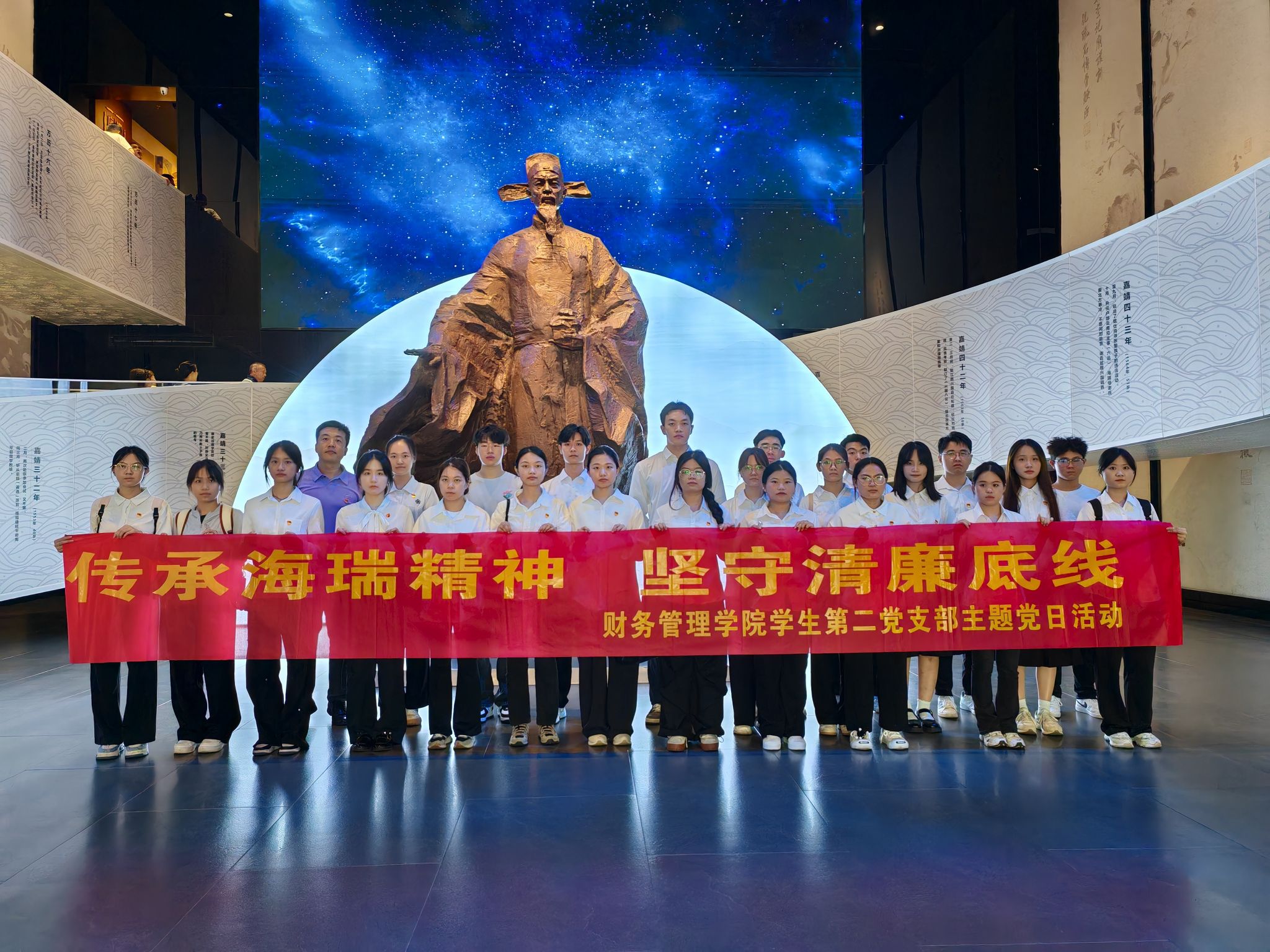2024年6月25日,财务管理学院学生第二党支部师生党员前往海瑞文化公园开展“传承海瑞精神 坚守清廉底线”主题党日活动,聆听海瑞故事,感受廉洁文化,接受思想洗礼,进一步推进党纪学习教育,强化纪律意识,筑牢思想防线。
