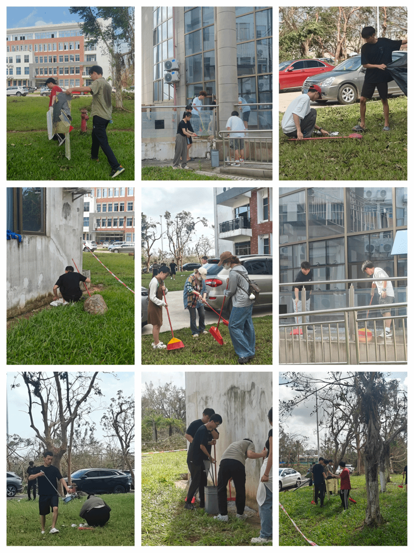在超强台风“摩羯”过境后,学校党委吹响了灾后重建、复工复课的冲锋号,人文艺术学校党总支第一时间响应并组织全体教职工和学生开展重建工作。风雨无情,校园有爱,大家团结协作,众志成城,发扬不怕苦、不怕脏的精神,对第六教学楼责任区域和经贸北路全面清扫伏倒树木、路面积水、残枝败叶、玻璃碎片等垃圾。老师和同学们携手并进,奋战在每一个角落,以坚定的眼神、刚强的姿态和实际行动诠释着责任与担当。
