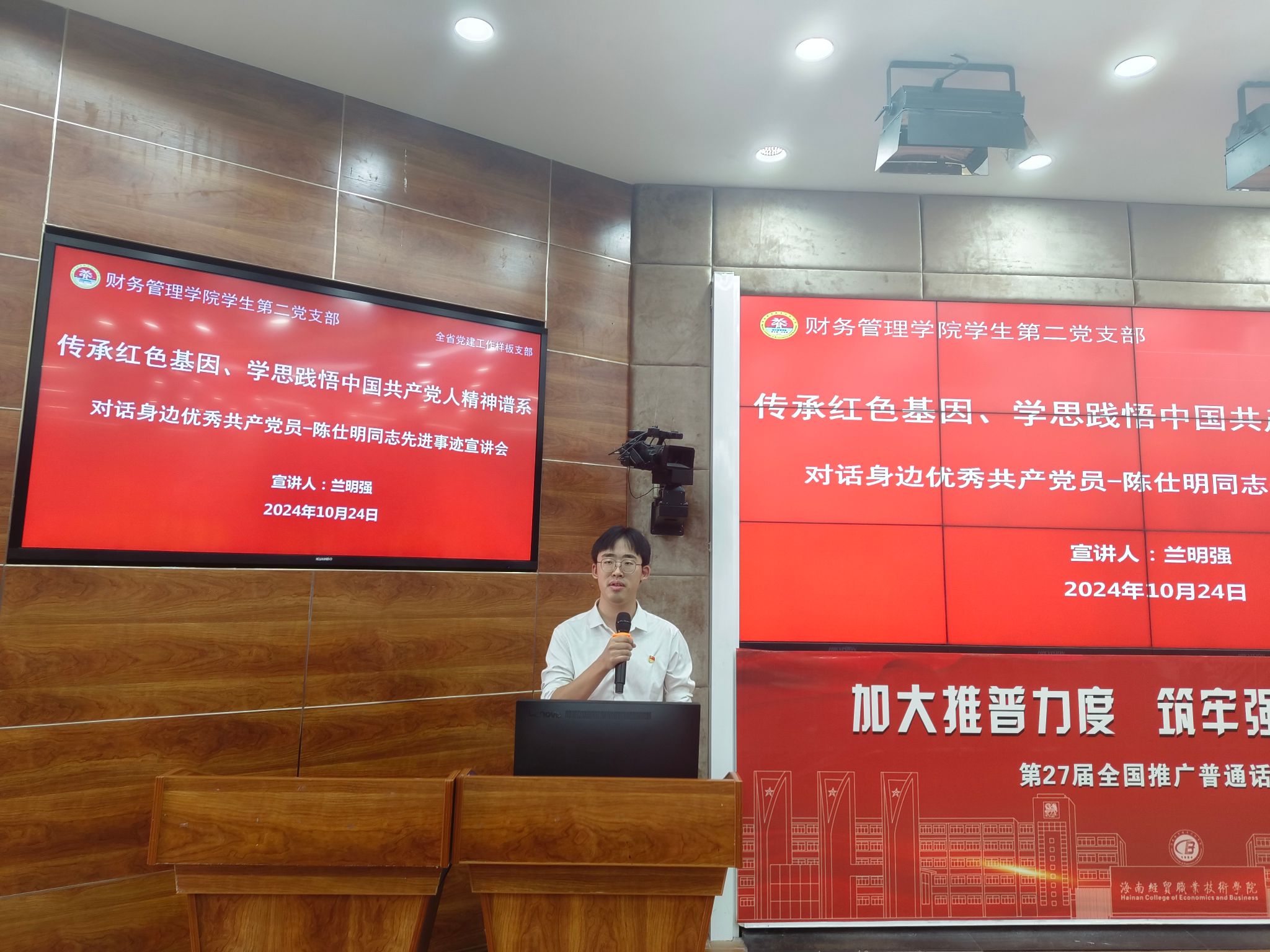 学生党员兰明强作首场宣讲。他详细介绍了2021年获得党中央颁发“光荣在党50年”纪念章的优秀共产党员陈仕明先进事迹,分享了陈仕明同志的入党初心、面对困难克服困难完成任务的坚强意志以及对年轻党员的建议。他说,我们新时代青年要传承红色基因、赓续红色血脉,做挺膺担当的奋斗者,坚持以“勤学习”为桨不畏风浪,以“敢担当”为帆不惧远航,以“勇创新”为刃划破茧壳,进一步开拓进取,砥砺前行,为海南自由贸易港高质量发展和中国式现代化贡献青春力量。