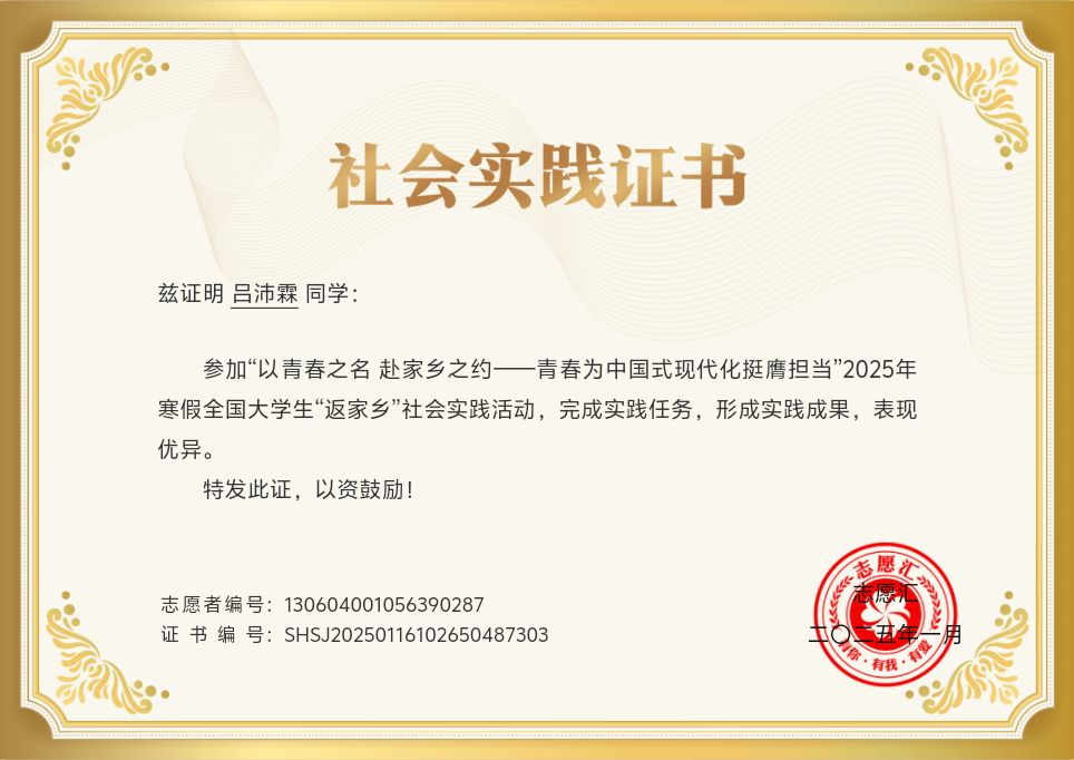 吕沛霖深知,人生的旅途并非一帆风顺,唯有不断学习、不断进步,历经挑战与困难,才能铸就坚韧不拔的品格,在竞争的舞台上脱颖而出,才能在人生的画卷上绘出最绚丽多彩的篇章。