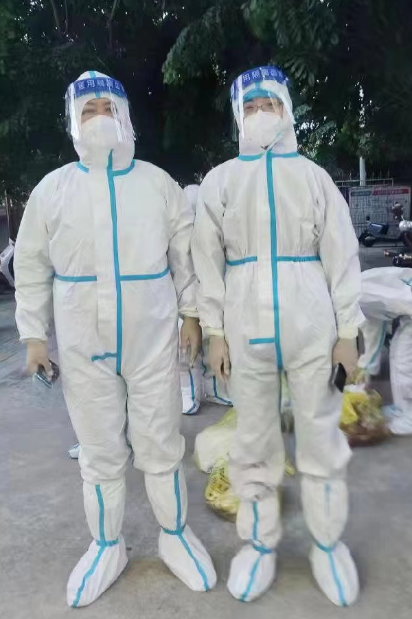 到村里工作,志愿者们发现一个严重的问题,村子里的疫情防控工作人员的防护穿戴并不规范,有的工作人员仅戴口罩参与配送物资等工作,消杀和手卫生也做得不够,脱卸防护装备没有固定区域等问题,田小林、范迪峰及时向负责人反馈。在村里工作的每一刻,他们都严格按照规范穿戴防护设备,并不断提醒身边的工作人员。在他们的提醒和示范下,全村工作人员个人防护要求均得到了提高。在田小林的推动下,长安村规范设置了脱卸防护服的“一脱区”“二脱区”,在他的建议下,在其他村工作的海经贸志愿者也帮助村里规范设置了脱卸区域。
