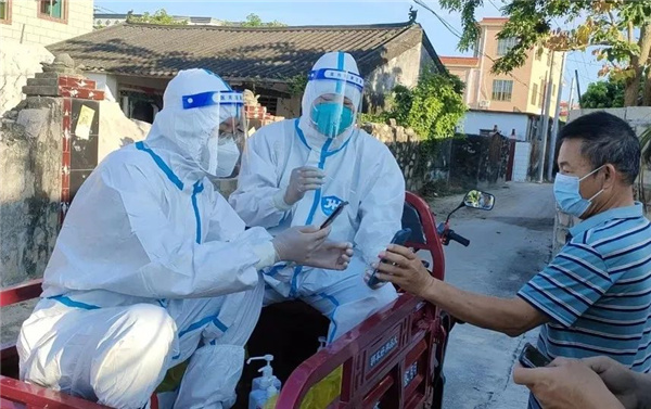 核酸检测是判断新冠病毒感染的金标准。协助做好全村村民的核酸采集工作是田小林等志愿者们每天的首要任务。长安村作为高风险区,每天早上5点40分按照“一人一管”方式入户采样,上午11点必须完成。时间紧、任务重,田小林笑称,在高风险区参与核酸采样工作拼的就是“速度与激情”,需要过“三关”:一是吃苦关,不仅要早起,还要克服包裹严实的防护服所带来的闷热;二是技术关,操作者必须熟练掌握采集系统的使用方法和大量村民没有健康码的手动数据录入;三是风险关,核酸采集需要直接与村民近距离接触,这对于非专业医务人员来说是一个较大的挑战。范迪峰血压高、血糖高,穿“大白”常常呼吸困难、头晕脑胀,即便这样,他也在坚持。