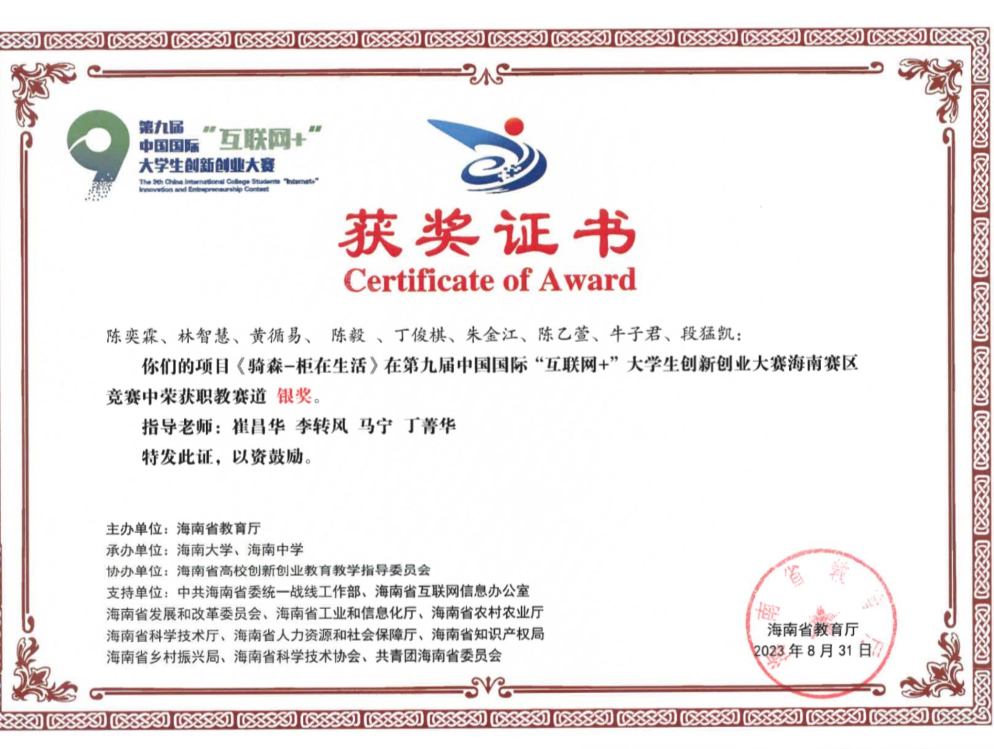 丁俊棋在创新创业的道路上,有很好的创意和很强的执行力。作为“骑森-柜在生活”项目的路演发言人,他精心准备每一个细节,投入大量时间进行练习,不断改进语音表达和肢体语言。“每一句话,我和我的团队成员都反复修改很多次,争取实现完美表达,让评委对我们的项目更感兴趣。”他和小伙伴们的努力和坚持也最终结出累累硕果,他们的项目在海南省第八届、第九届“互联网+”大学生创新创业大赛和2022年“挑战杯”大学生创新创业计划竞赛省级决赛中获得银奖。