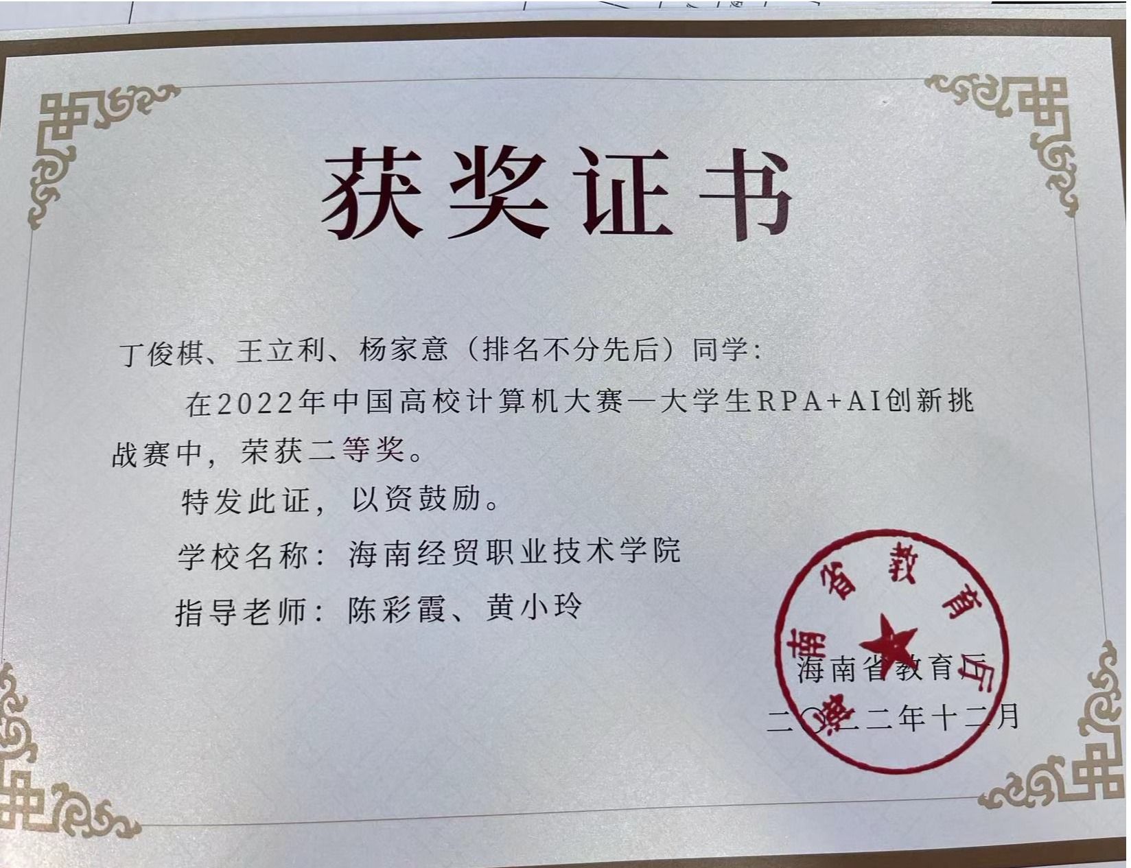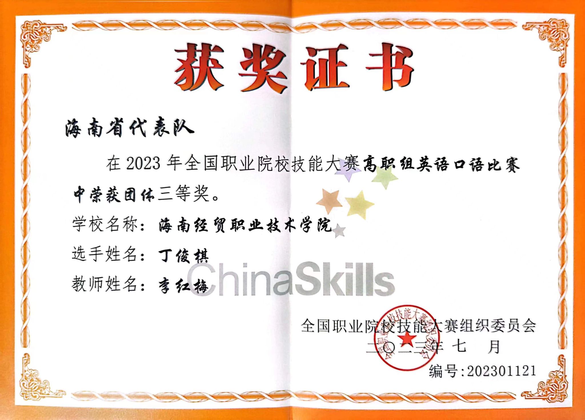 “班长的成绩最好,是我们学习的榜样!” 同学们提到丁俊棋时都竖起大拇指。连续两年取得专业第一名的好成绩,成功通过英语四、六级和计算机二级考试,获得全国职业院校技能大赛“英语口语”赛项三等奖,是海南省首个全国职业院校技能大赛英语口语非专业组奖牌,荣获第十一届“挑战杯”海南省大学生课外学术科技作品竞赛二等奖……成绩的背后是丁俊棋不懈的努力。