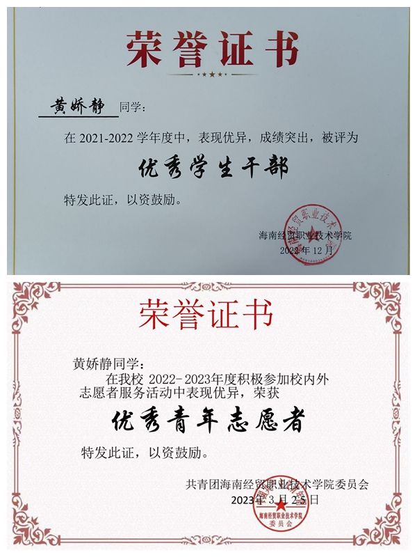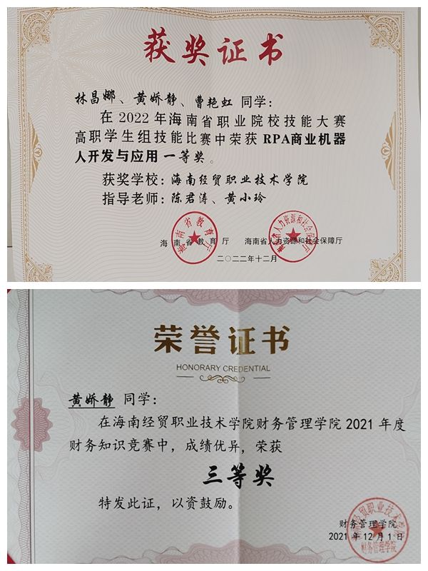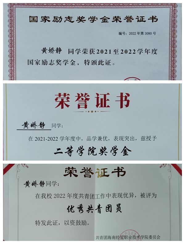 “今天要比昨天好。”这是她成功路上的法宝。黄娇静积极参加学校各项活动和专业知识讲座,锻炼自己的能力和技能。她参加了2022年海南省职业院校技能大赛,在备赛过程中,她和队友们紧密协作,共同面对开发难题,互相支持和鼓励,经过数日的激烈角逐,最终荣获了“RPA商业机器人开发及应用”赛项一等奖。她还荣获校级一、二等学院奖学金,优秀学生干部、优秀共青团员、优秀青年志愿者、财务管理学院“财务知识竞赛”三等奖等奖项。