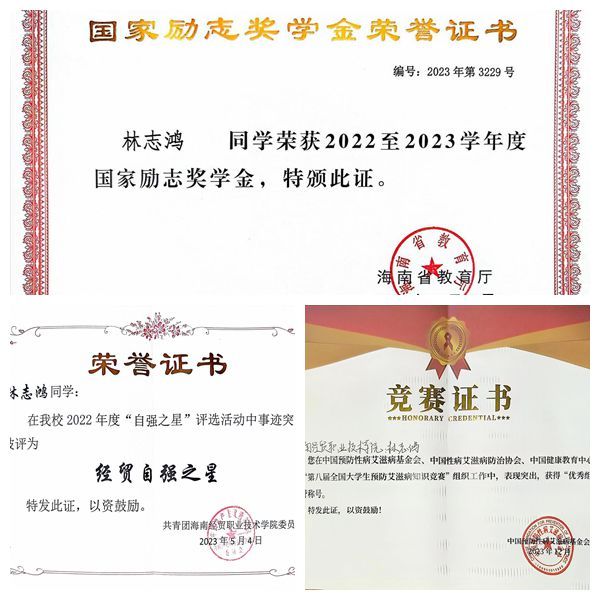 林志鸿性格开朗,在校期间曾担任班长、计算机协会会长,校青年志愿者协会会长等。他积极参与各类志愿服务活动,个人志愿服务时长累计达到329.41小时;在职业教育活动周“技能进社区”中,依托自身专业知识,带领计算机协会成员开展“电脑义诊”志愿服务。他积极参与大学生暑期“三下乡”社会实践活动,被评为学校暑期社会实践积极分子。在学习和竞赛方面也表现出色,曾荣获国家励志奖学金、第九届中国国际“互联网+”大学生创新创业大赛校赛银奖、2022年度“经贸自强之星”、第八届全国大学生预防艾滋病知识竞赛优秀组织者、第十八届“挑战杯”校级赛二等奖、学校2023年度“优秀共青团员”“优秀青年志愿者”等荣誉。