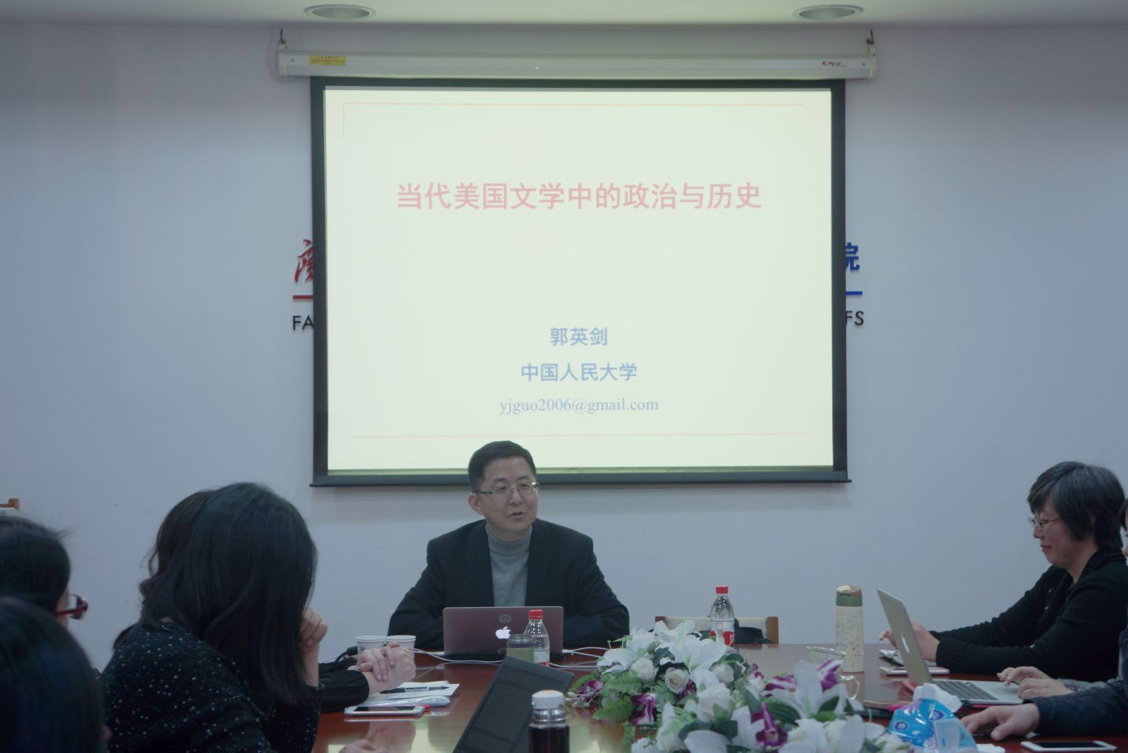 讲座伊始,郭英剑教授先对师生们陈述了自己的研究方向、感兴趣的内容并谈及了政治的重要性,希望借此机会与师生们交流自己对美国文学的认识。本次讲座的主要内容包括美国当代文学背景与社会政治语境、2016诺贝尔文学奖、2016年美国国家图书奖、2017年美国国家图书奖及美国当代文学特征,共计五个方面。