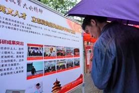 摊宣现场的展板,展示了英文学院团委开展的“踏寻革命足迹,追忆峥嵘岁月”示范性团日活动、“走进马克思”专题讲座等纪念“五四”运动100周年的系列活动。展板中还呈现了自党的十八大以来,英文学院在校党委的正确领导下,取得的丰硕科研业绩和育人成果,体现了英文学院“立德树人”的理念。展板吸引了过路同学驻足观看。