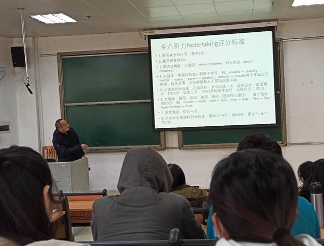 然后,鲁守春老师介绍了专八考试流程。专八考试与我们平常的考试在流程上有比较大的差别。专八考试过程中答题卡的收发流程上体现了对学生听力、阅读、写作等各项能力的考查都有严格的时间限制。这就为我们每位同学敲响警钟,我们要熟练掌握并应用听说读写译五项基本的语言技能,因为我们在考场上不能通过时间的分配来掩盖技能上的弱点。