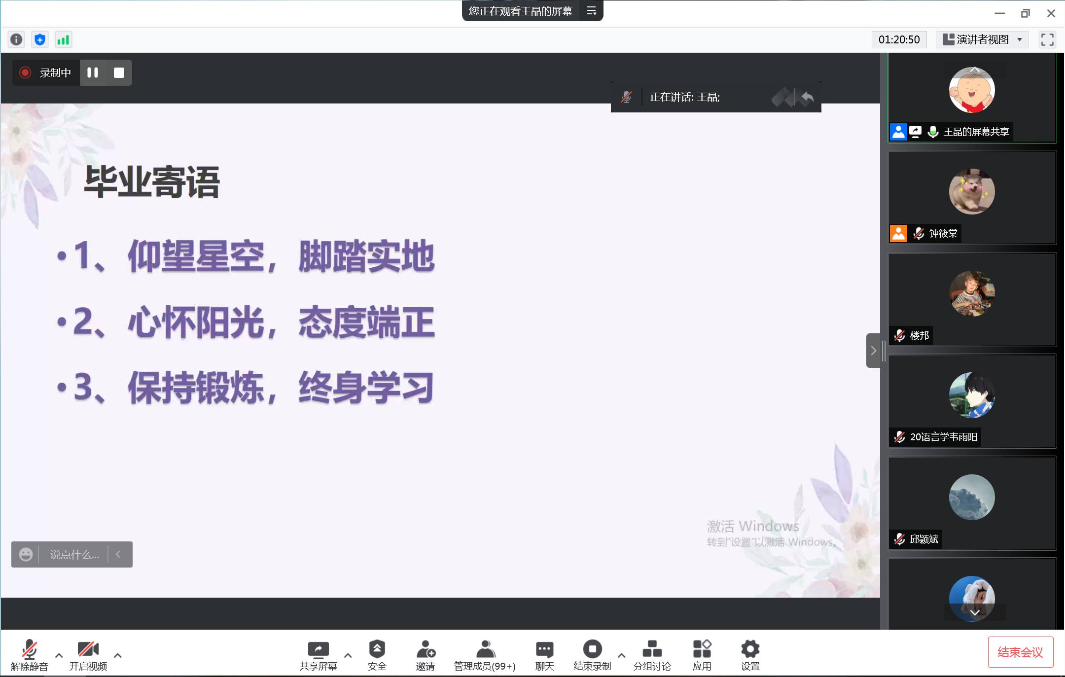 会议最后,王晶老师强调,正值中国共青团成立100年之际,咱们青年学生正当年华,走进社会要不怕苦,能吃苦,对自己的所有行为举止负责,体现自己的社会担当,多观察,多学习。王晶老师还与同学们分享了自己对所有同学们的毕业寄语和毕业祝福,相信雨过天晴,总会有彩虹,希望大家调整好心态,长远发展,大家一定会找到自己满意的职业与岗位,在社会中创造个人价值,迎接新的开端。同时,王晶老师强调同学们应常怀感恩之心,对这一路上陪伴自己的家人、朋友与老师心怀感激,脚踏实地,最后祝愿所有同学前程似锦。
