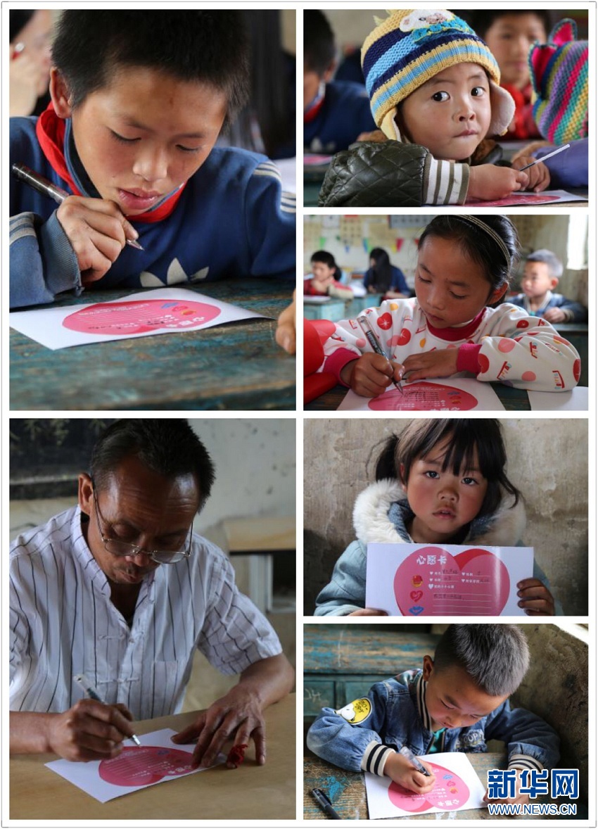 在“点亮微心愿”活动中,老师和孩子们分别写下自己的心愿(拼版图片)。新华网发(受访者供图)