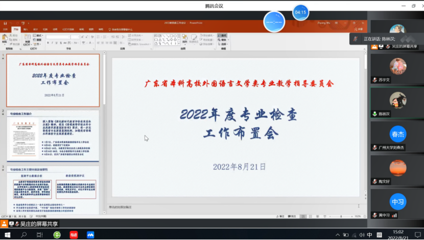 本网讯 2022年8月21日下午,广东省本科高校外语类专业教学指导委员会(以下简称“外指委”)秘书处组织召开广东省教育厅布置的专业检查工作布置会,会议通过腾讯会议进行。外指委主任委员、伟德国际1946源于英国原副校长陈林汉教授出席会议,外指委秘书长、伟德国际1946源于英国副院长吴庄教授主持,外指委各委员以及各分委员会秘书长等27人线上参会。